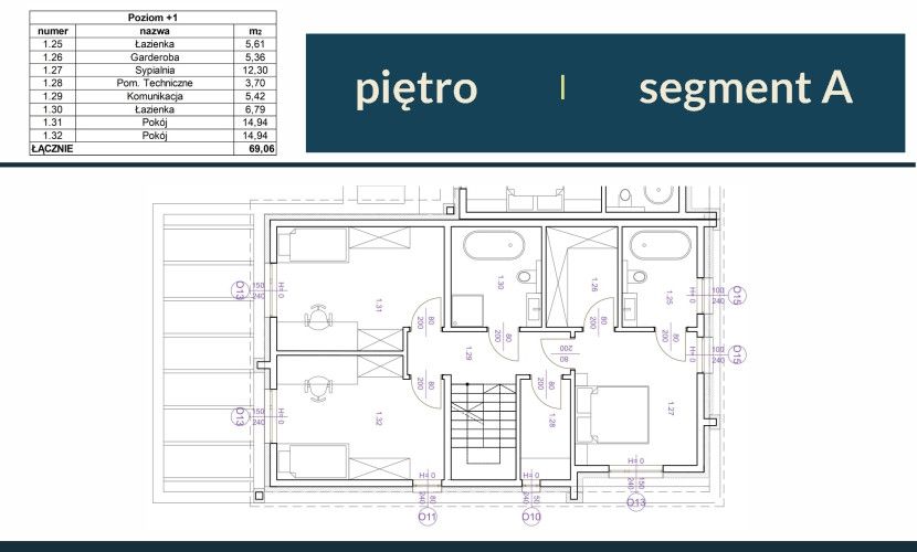 Na piętrze znajdują się 3 sypialnie. Największa z nich posiada swoją prywatną garderobę i łazienkę. Dwie pozostałe położone są po drugiej stronie domu. Dopełnieniem tej kondygnacji jest duża łazienka oraz pomieszczenie techniczne, które może sprawdzić się jako dodatkowa garderoba.