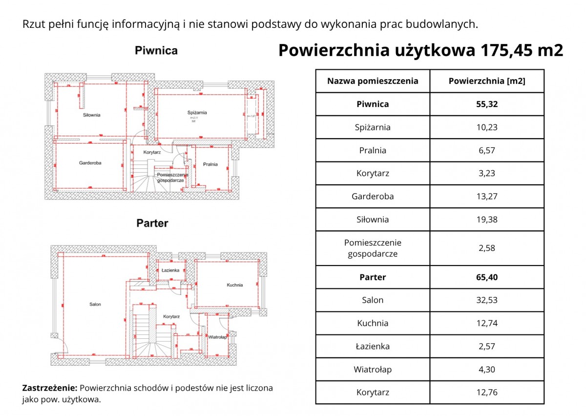 - Piwnica – 55,32 m2, parter – 65,40 m2, piętro – 46,58 m2, poddasze – 8,15 m2 pow. użytkowej