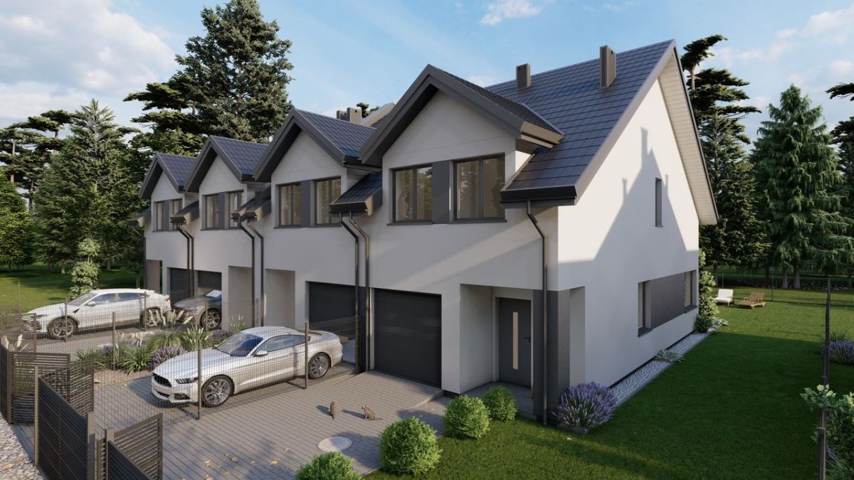 Budynki charakteryzują się elegancką, jasną elewacją z szarymi akcentami oraz dwuspadowym dachem pokrytym stylową dachówką. Duże przeszklenia zapewniają doskonałe doświetlenie wnętrz.