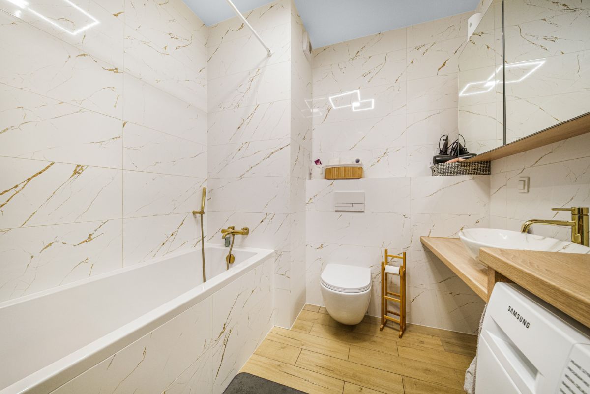 Ostatnim z pomieszczeń jest łazienka z wanną. Komfort mieszkańców zwiększy również miejsce postojowe, znajdujące się w hali garażowej.