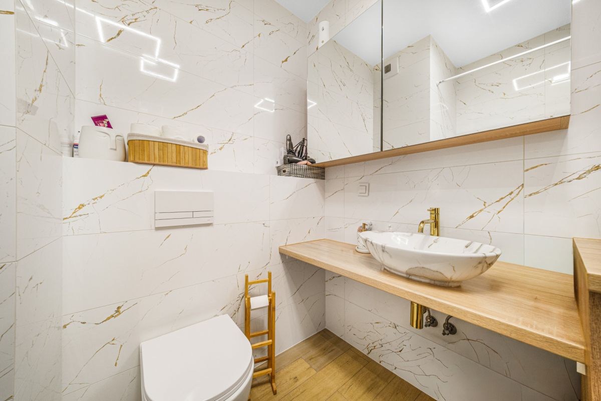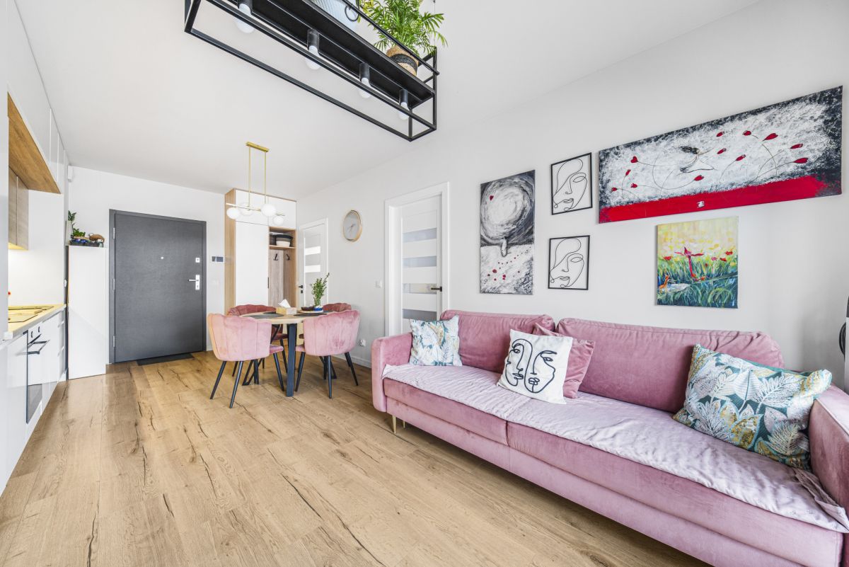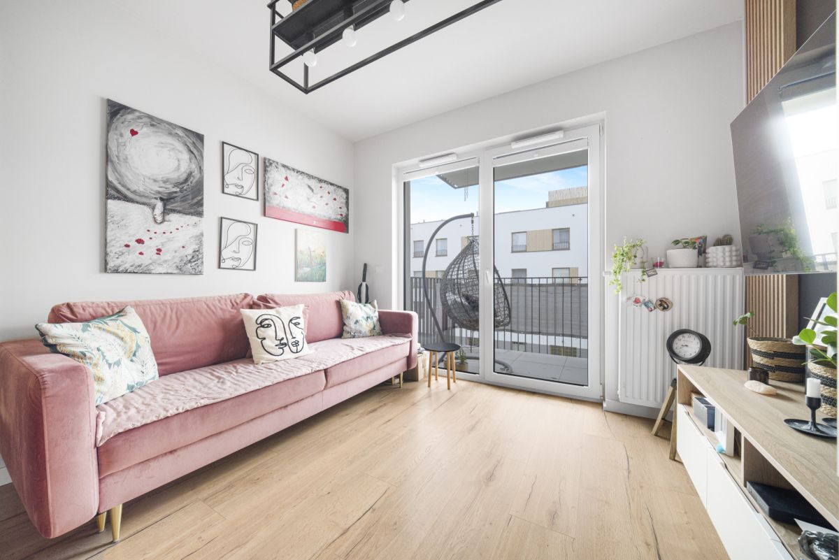Druga część salonu to przestrzeń wypoczynkowa, w której znajduje się wygodna sofa oraz telewizor. Stąd również możesz wyjść na balkon, który będzie idealnym miejscem do relaksu, szczególnie w gorące dni.