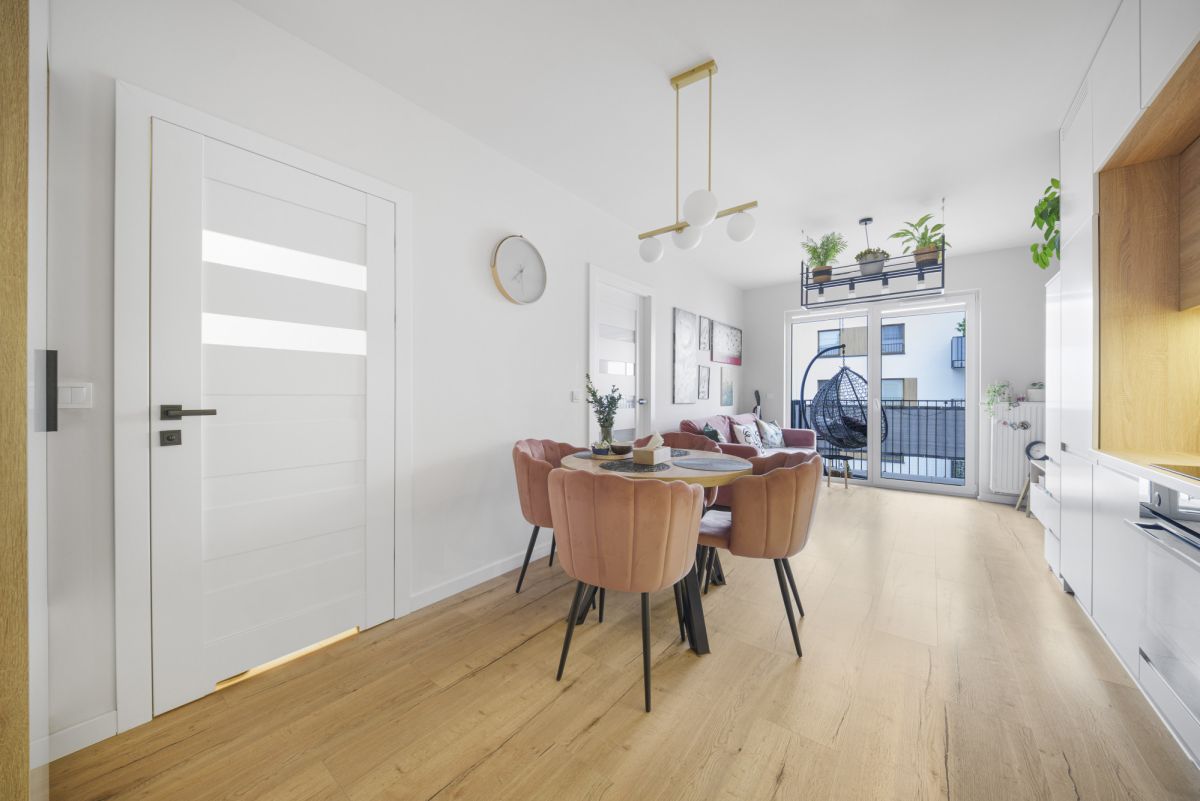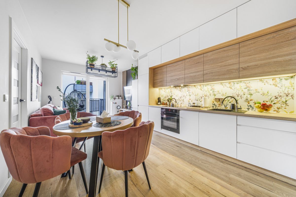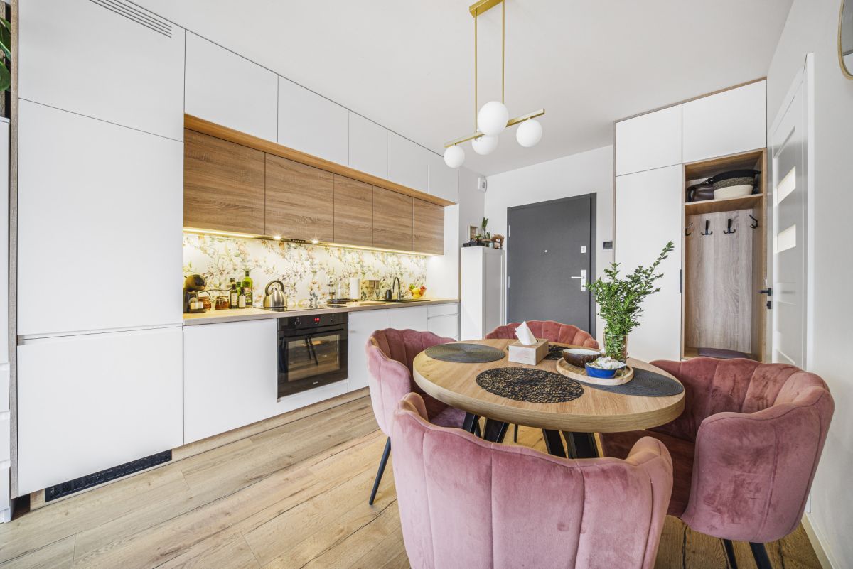 Sercem mieszkania jest przestronny salon, składający się z 2 części. Pierwsza z nich – część kuchenna to w pełni wyposażona kuchnia ( płyta indukcyjna, zmywarka, piekarnik) oraz przestrzeń jadalniana z okrągłym stołem.