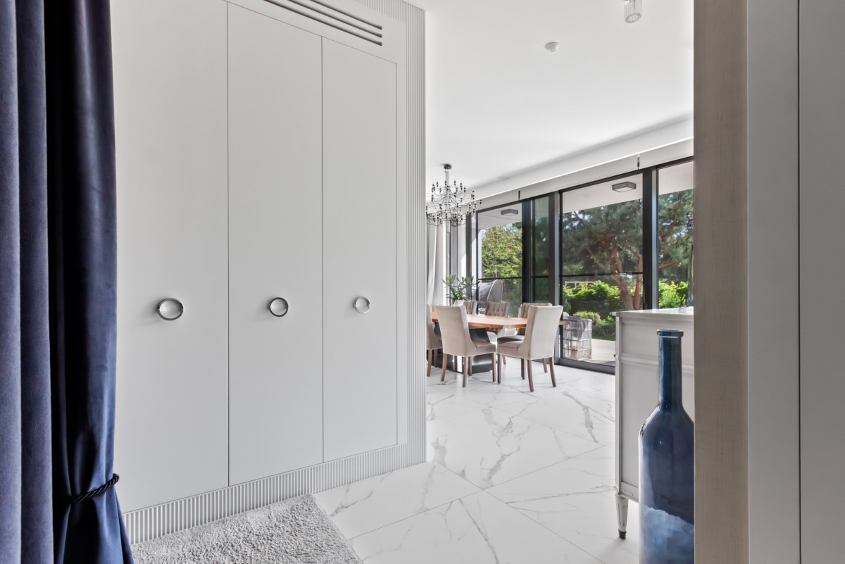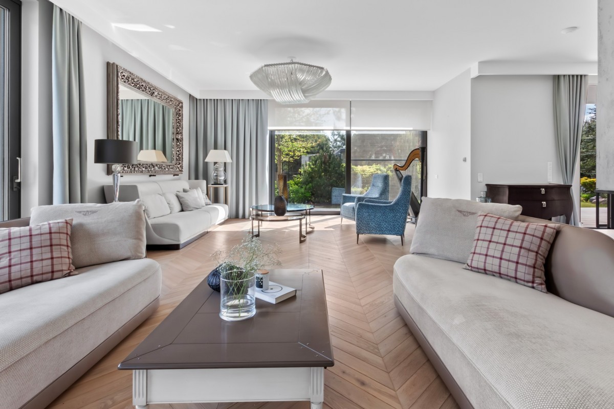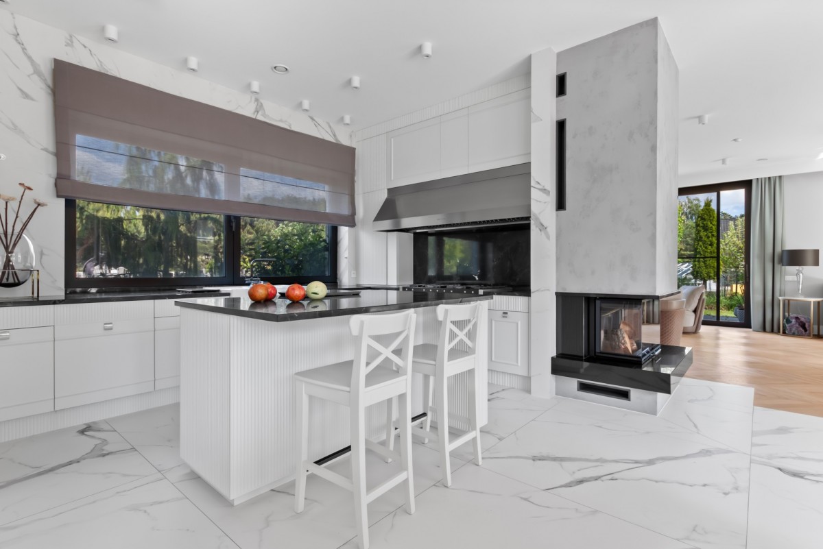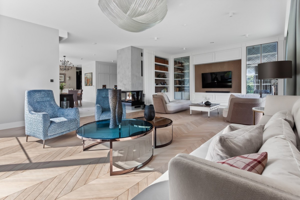 • Imponująca część dzienna – salon o powierzchni 48,70 m² z wyjściem na taras, kominkiem i systemem kina domowego