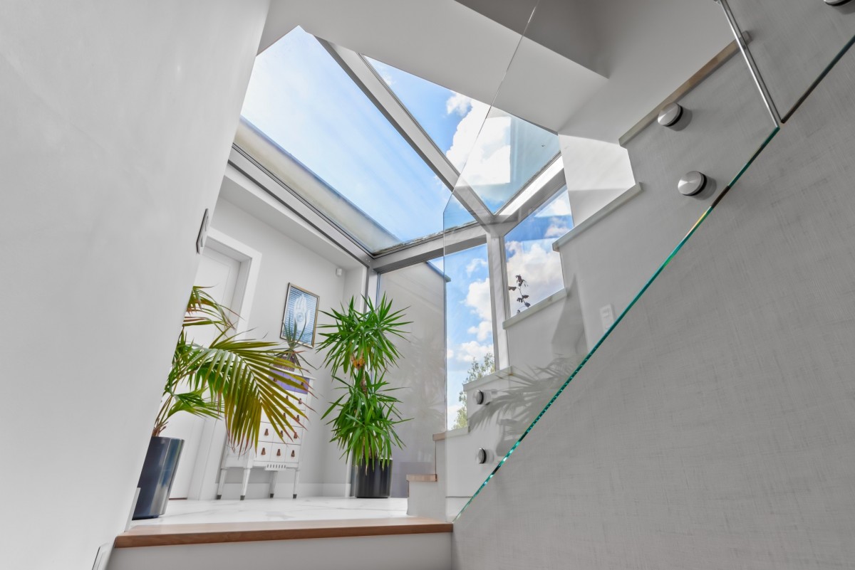 • Ogromne, aluminiowe okna z elektrycznymi roletami (system Somfy) zapewniają mnóstwo naturalnego światła i widok na zadbany ogród.