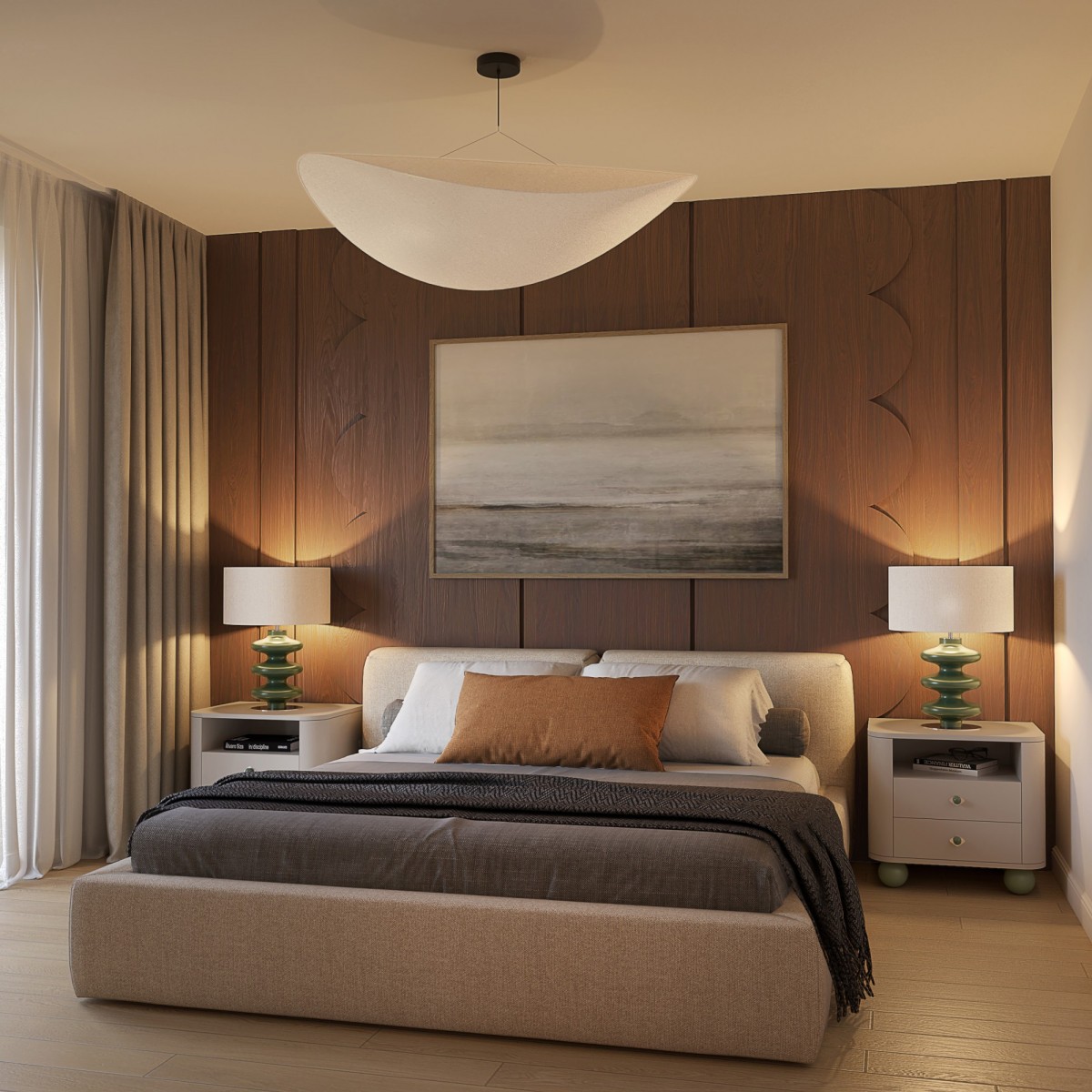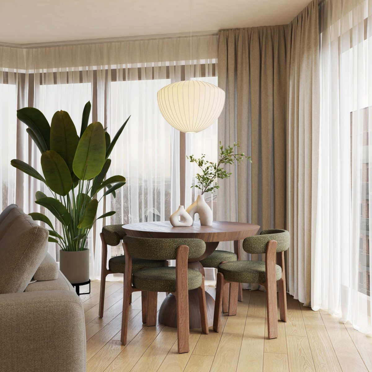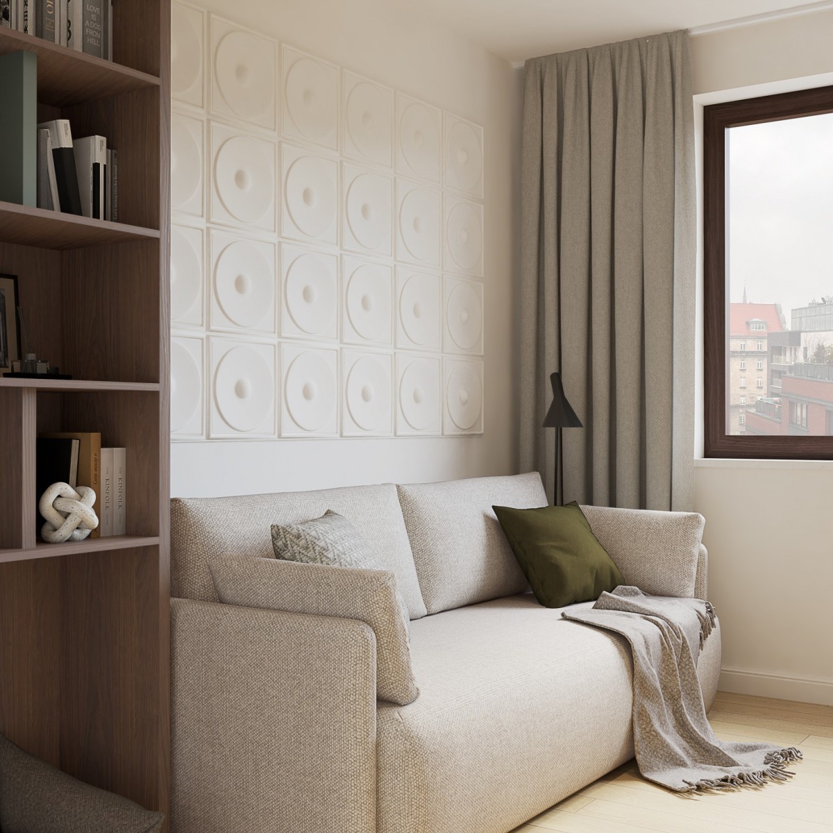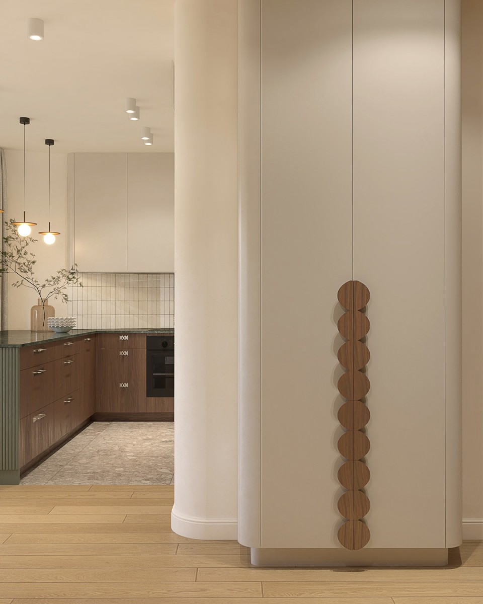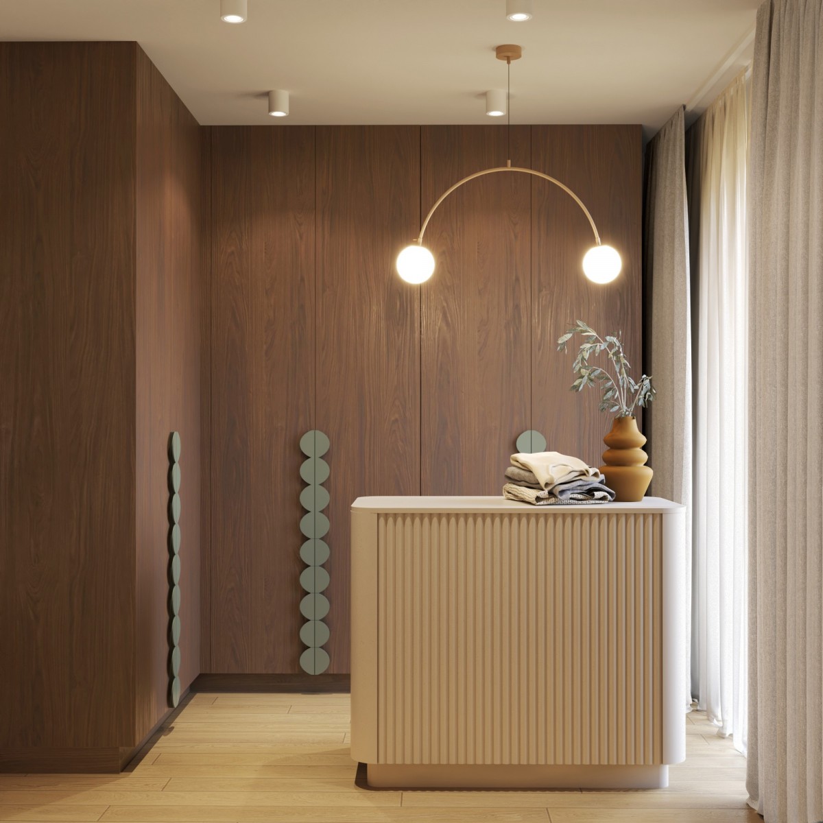 - Światło i przestrzeń – głównym atutem apartamentu są duże okna, które wypełniają wnętrze naturalnym światłem i sprawiają, że przestrzeń jest jasna i przyjemna o każdej porze dnia.