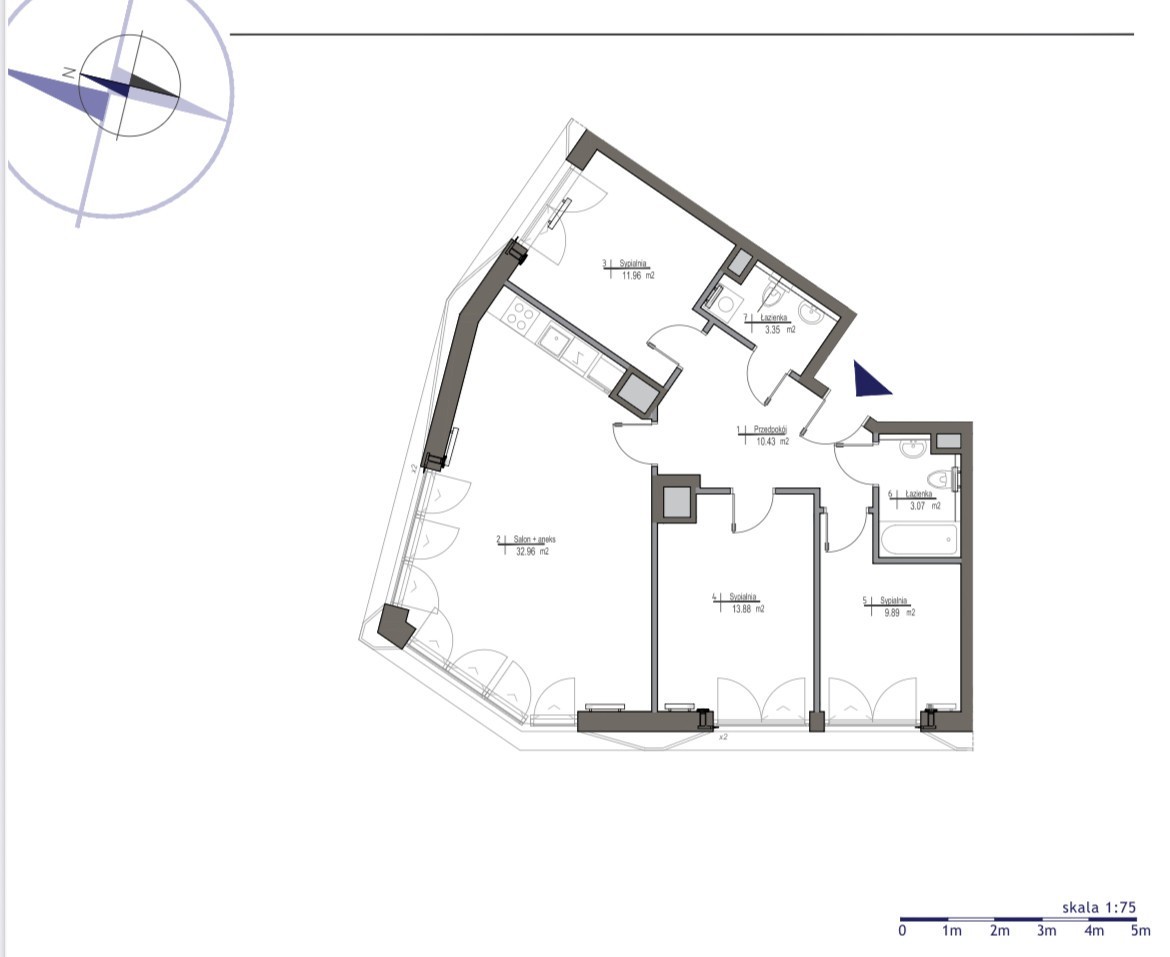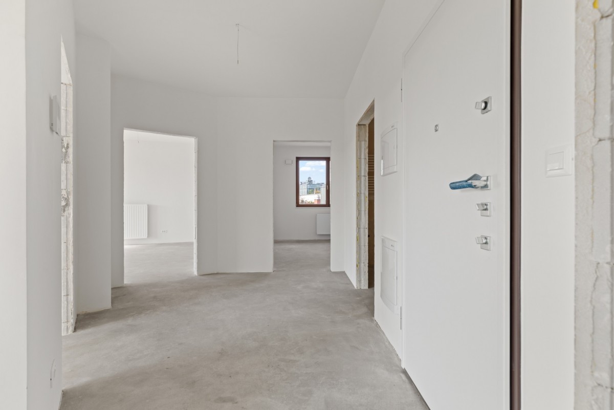 - Przemyślany układ – salon z aneksem kuchennym, trzy sypialnie, łazienka, toaleta i przedpokój z miejscem na zabudowę tworzą wygodne i funkcjonalne wnętrze.