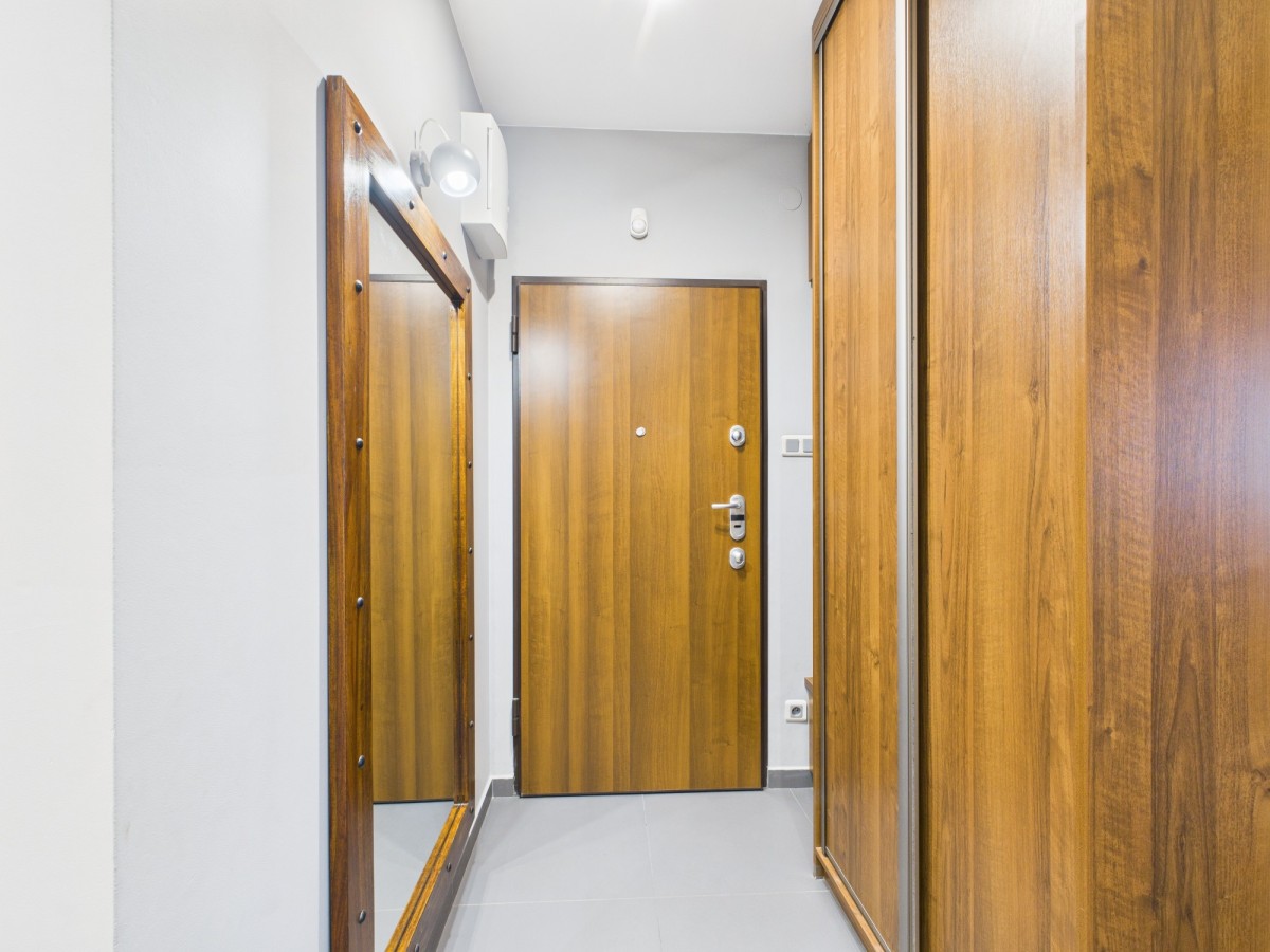 Obecnie mieszkanie posiada pojemną garderobę (1,8 m²), jednak dzięki zachowaniu wszystkich przyłączy sanitarnych, można ją z łatwością przywrócić do pierwotnej funkcji osobnej toalety (WC), zgodnie z załączonym planem deweloperskim. Wysokość pomieszczeń to 268 cm.