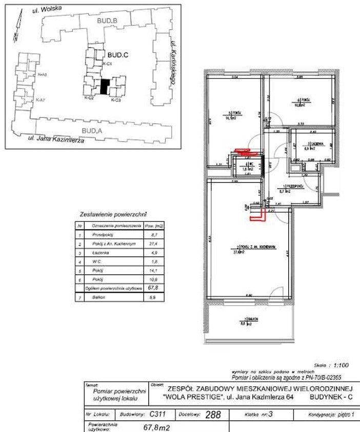 Lokal o powierzchni 67,8 metrów kwadratowych znajduje się na 1 piętrze 5-cio piętrowego  budynku mieszkalnego wielorodzinnego.