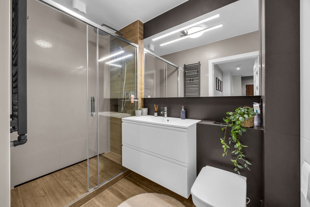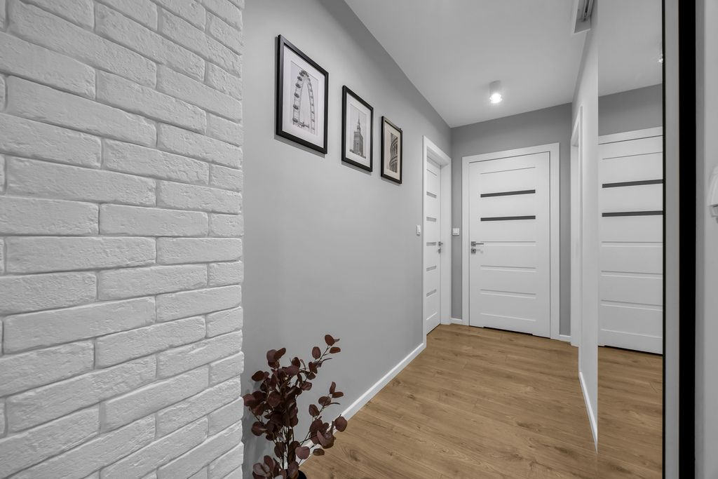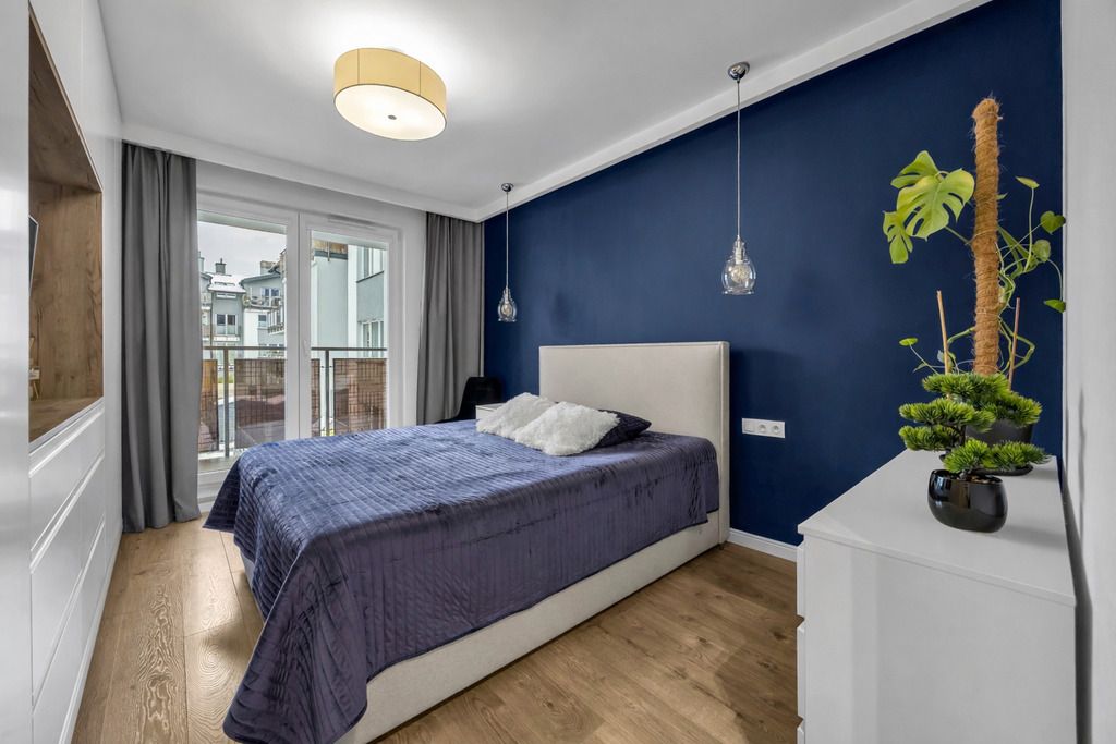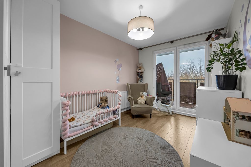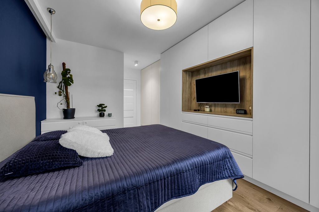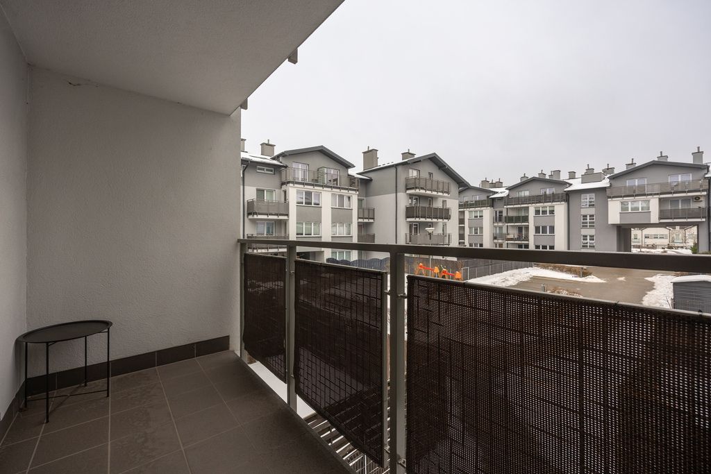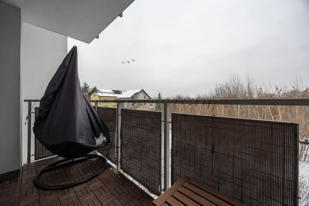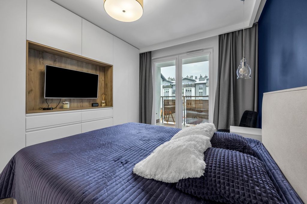 Do mieszkania przynależą również 2 balkony (4,64 m2 i 4,48 m2), na które znajduje się wyjście z obu pokoi i salonu. Lokal został urządzony w sposób przytulny, nowoczesny i bardzo funkcjonalny. Liczne zabudowy stolarskie wykonane na wymiar zapewniają dużą ilość miejsca do przechowywania, jednocześnie zachowując estetykę i porządek we wnętrzu.