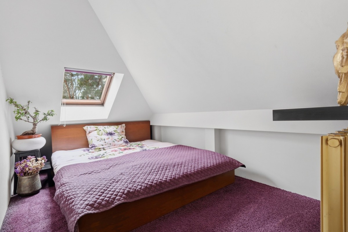 Na piętrze mieszczą się dwie antresole oraz trzy sypialnie, które mogą pełnić funkcję pokoi dziecięcych, gabinetu lub prywatnej strefy wypoczynku. Wnętrza utrzymują przyjemną temperaturę w okresie letnim, co znacząco podnosi komfort użytkowania.