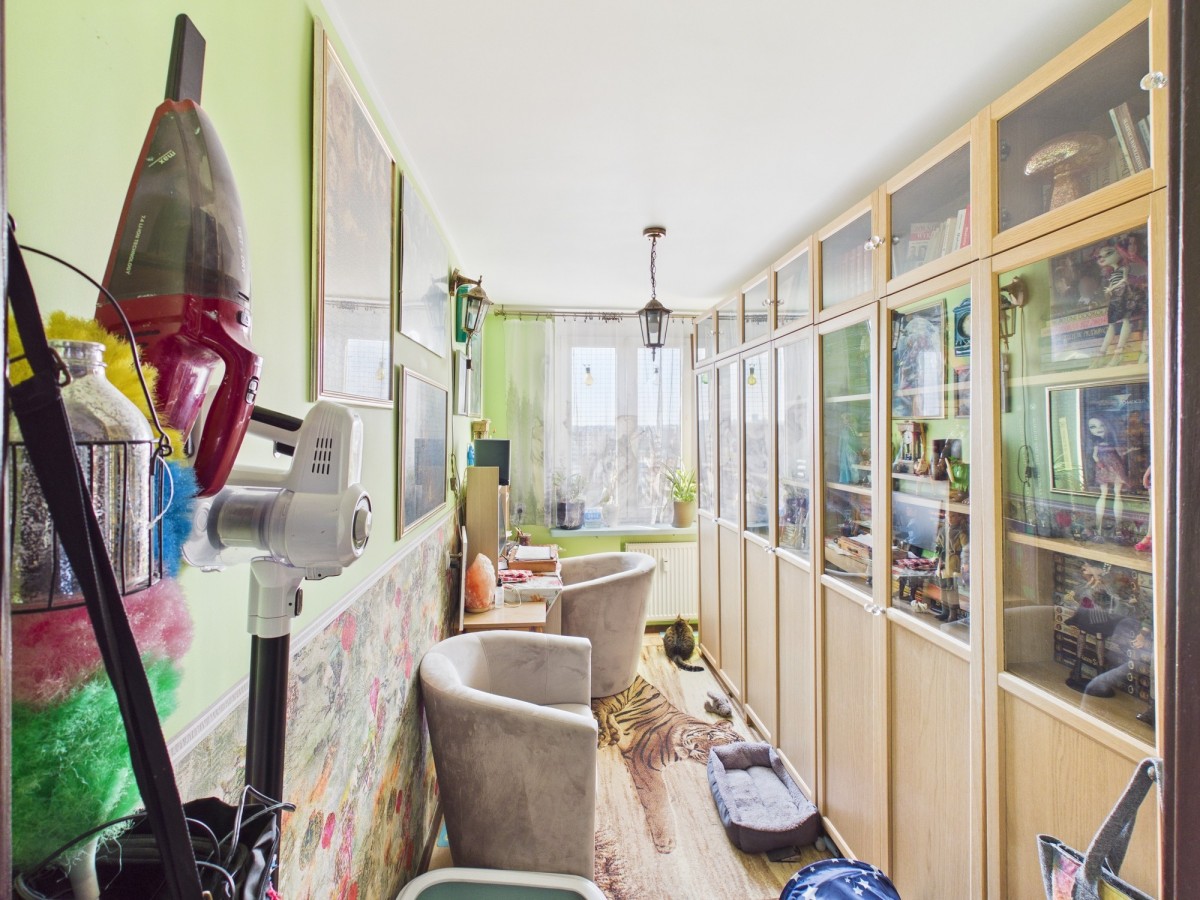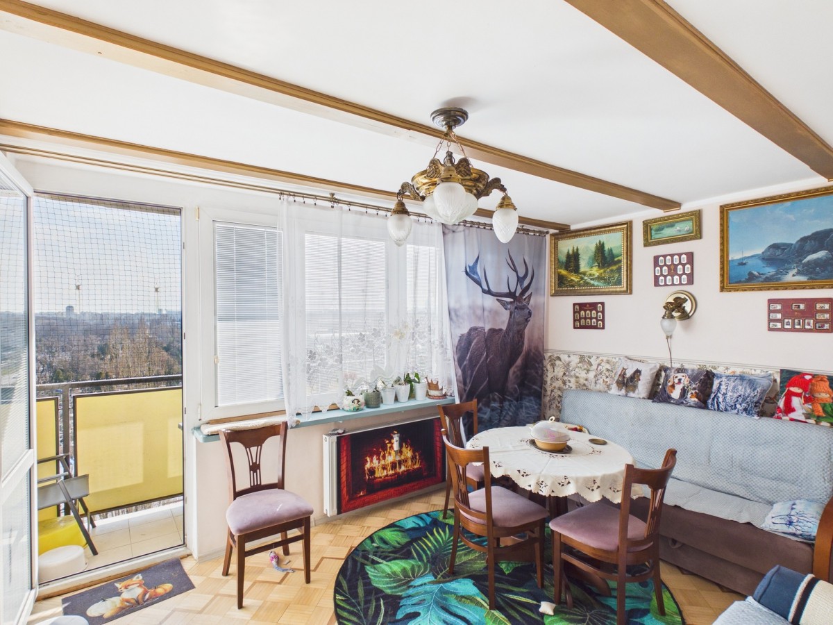 Lokal jest widny, rozkładowy i bardzo ustawny, z pięknym widokiem na panoramę Warszawy. Składa się z trzech oddzielnych pokoi o powierzchniach 17,5 m², 10,5 m² oraz 7 m², osobnej kuchni z oknem (7 m²) oraz łazienki z WC. Kuchnia i łazienka są urządzone i wyposażone – w łazience znajduje się zarówno wanna, jak i prysznic. W pokojach drewniany parkiet.
